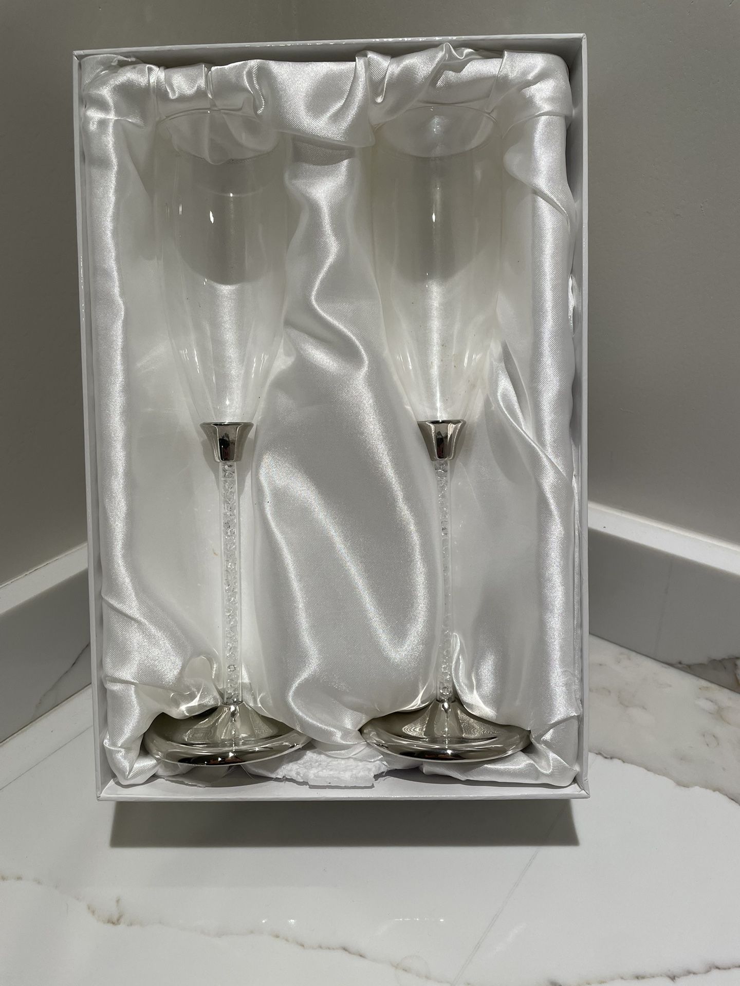 Set of two elegant champagne flutes with crystal stems. Perfect for weddings.