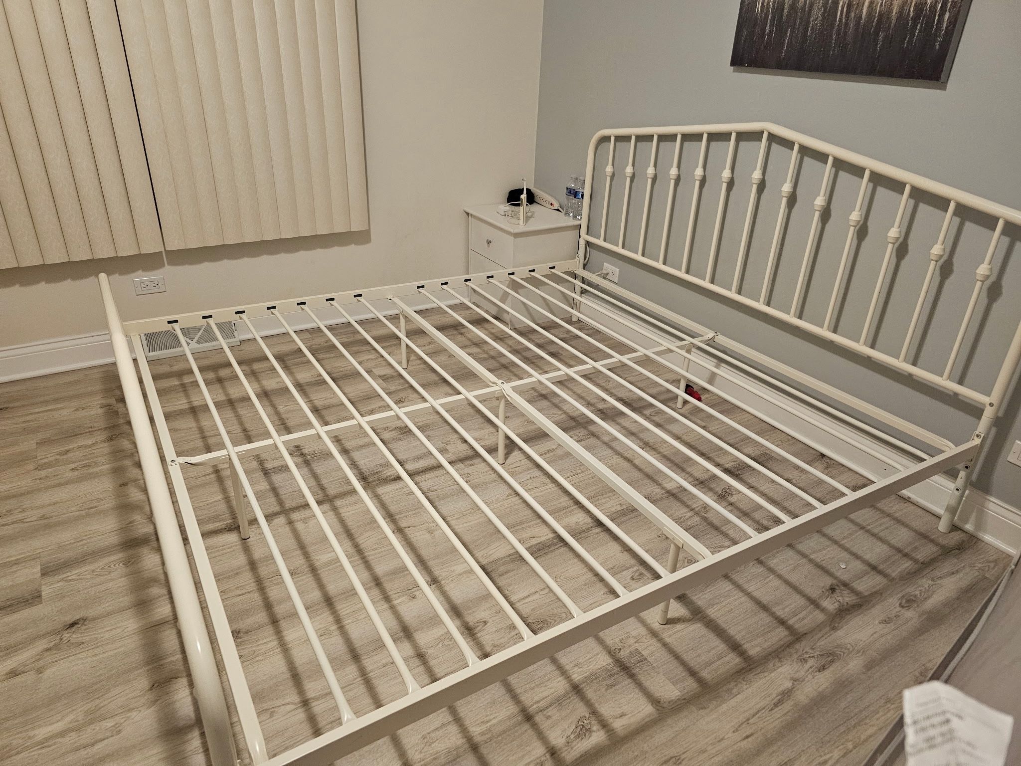 White king bed frame. Perfect condition, sturdy, and pretty. Barley used at all
