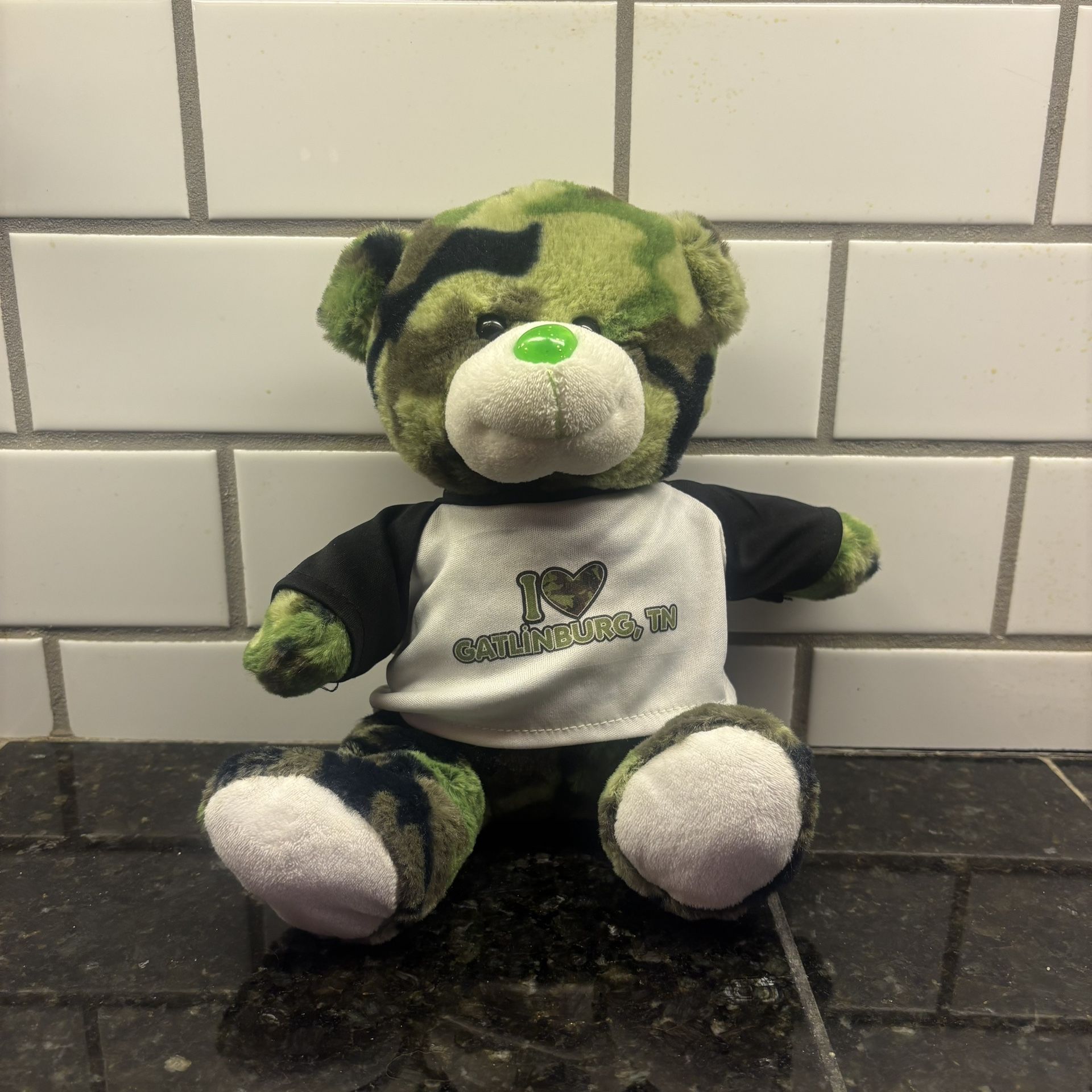 This adorable camo-pattern teddy bear is the perfect Gatlinburg souvenir! The bear features a soft green, brown, and black camo design, a bright green nose, and a white T-shirt that reads “I ❤️ Gatlinburg, TN.” It’s clean, gently used, and well-kept with no major flaws—great for collectors, kids, or anyone who loves Tennessee gifts. Approx. size: About 10–12 inches tall (sitting). Comes from a smoke-free home. A cute and unique plush for anyone who loves Gatlinburg or wants a fun camo-themed bear! 🧸💚