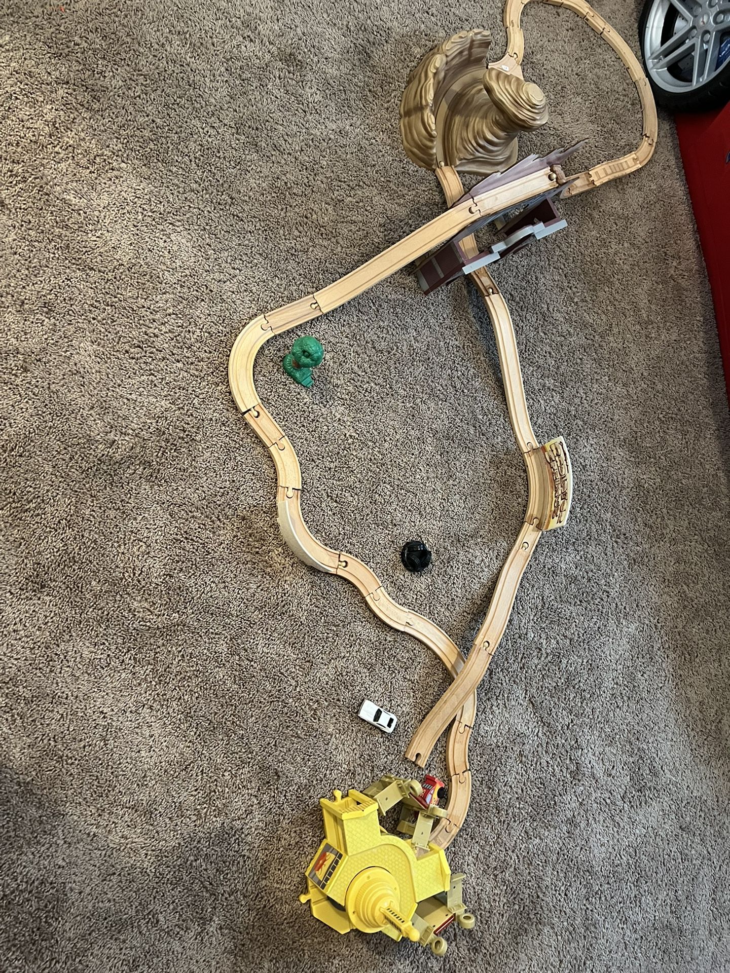A wooden Cars Land track with over 30 pieces. Pieces can be removed and adjusted to create your own track.