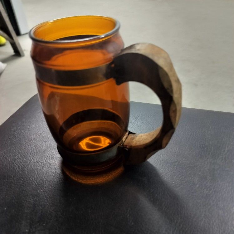 Vintage Siesta Ware Amber Glass Mugs, Barrel Shaped with Carved Wood Handles and Brass Tone Bands around top and bottom, 7 Mugs Total, Used Condition, No Chips or Cracks, Shows some wear on bands and handles Also 1 mug only with Western Themed Design, Total 8 Mugs