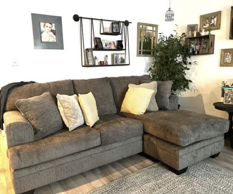 Selling My Gray Modern Reversible Sectional Sofa. Comfortable Back and Seat Cushions, Smooth Microfiber Fabric, Reversible Chaise, Clean. Excellent Shape. Original Condition. Made by Ashley Furniture. Dimensions: 89in Long, 39in Wide, 63in Chaise, 19in Seat, 33in Tall. Pickup in 92109 or Delivery with Zipcode.