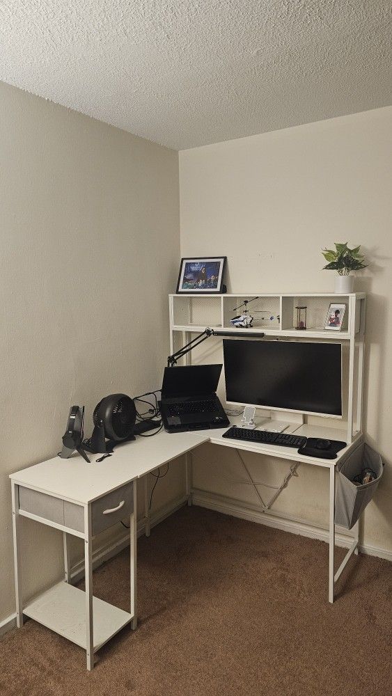 L shaped Desk With Shelf, Power Outlet, LED Lights and Drawer