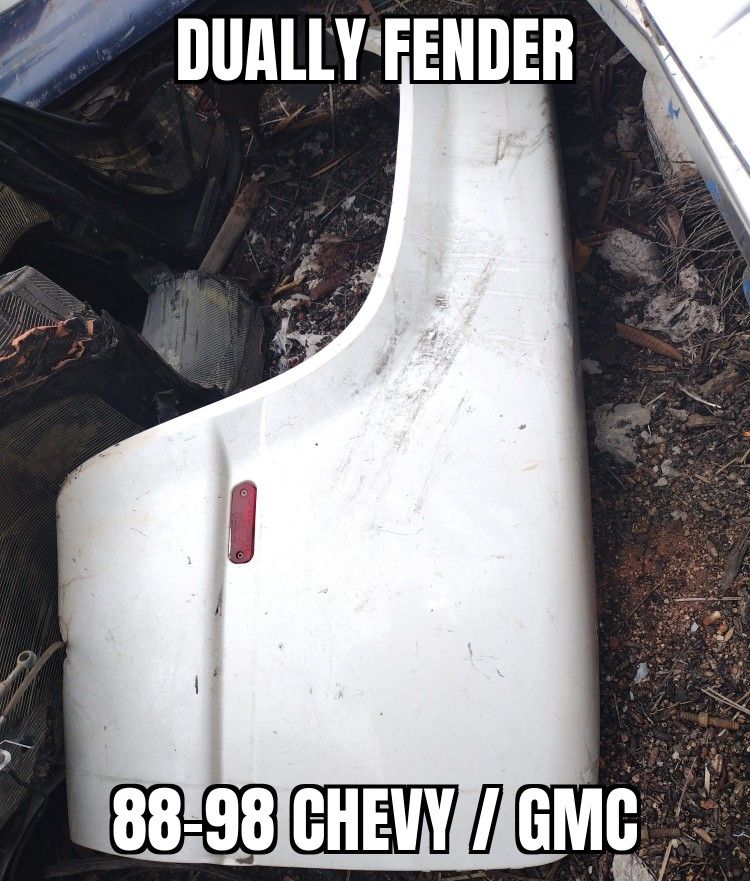 Driver side dually fender for 88 through 98 Chevy or GMC truck. Not perfect but very fixable and it's an oem fender.