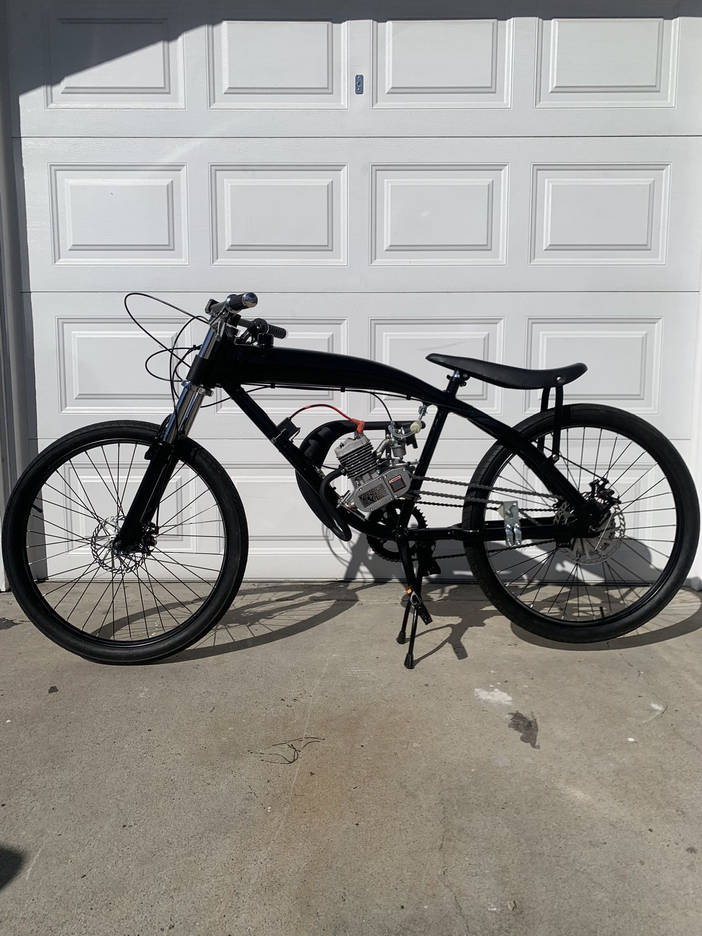Brand new, ready to ride. Aluminum gas tank frame. Powerful 80cc 2 stroke engine. Upgraded exhaust pipe. Front and rear Disk Brakes. Heavy duty wheels. Front suspension. 45MPH Top Speed! Asking $650 obo