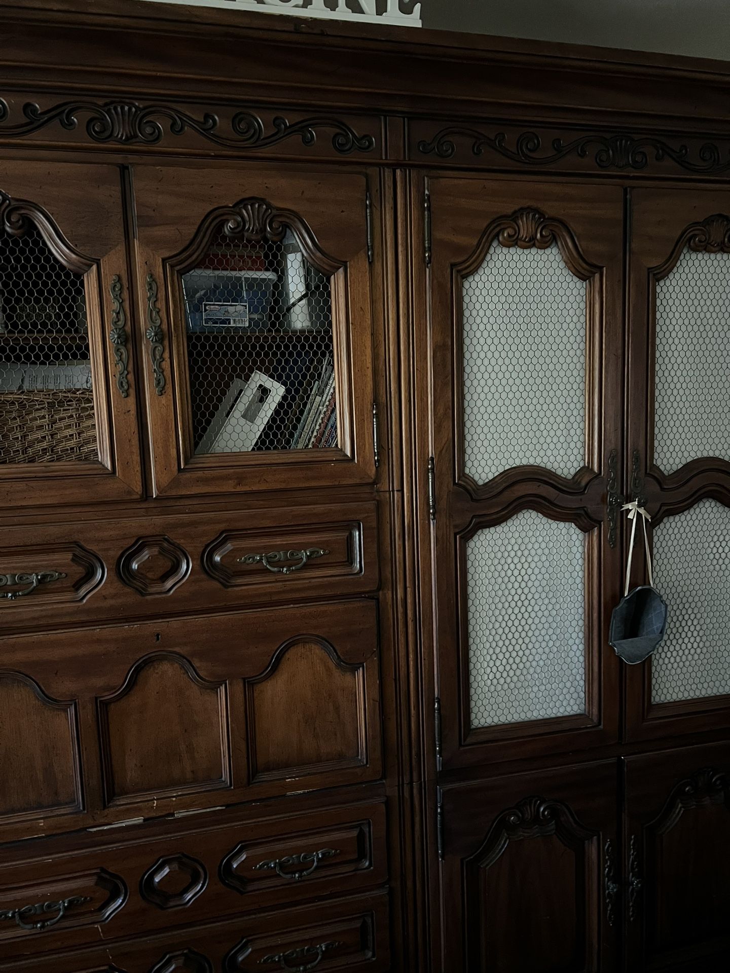 Beautiful 3 piece storage 9 ft. Shelves and drawers plus pull down desk. Sturdy, complete storage unit. I love it, but moving. You’ll love it too!