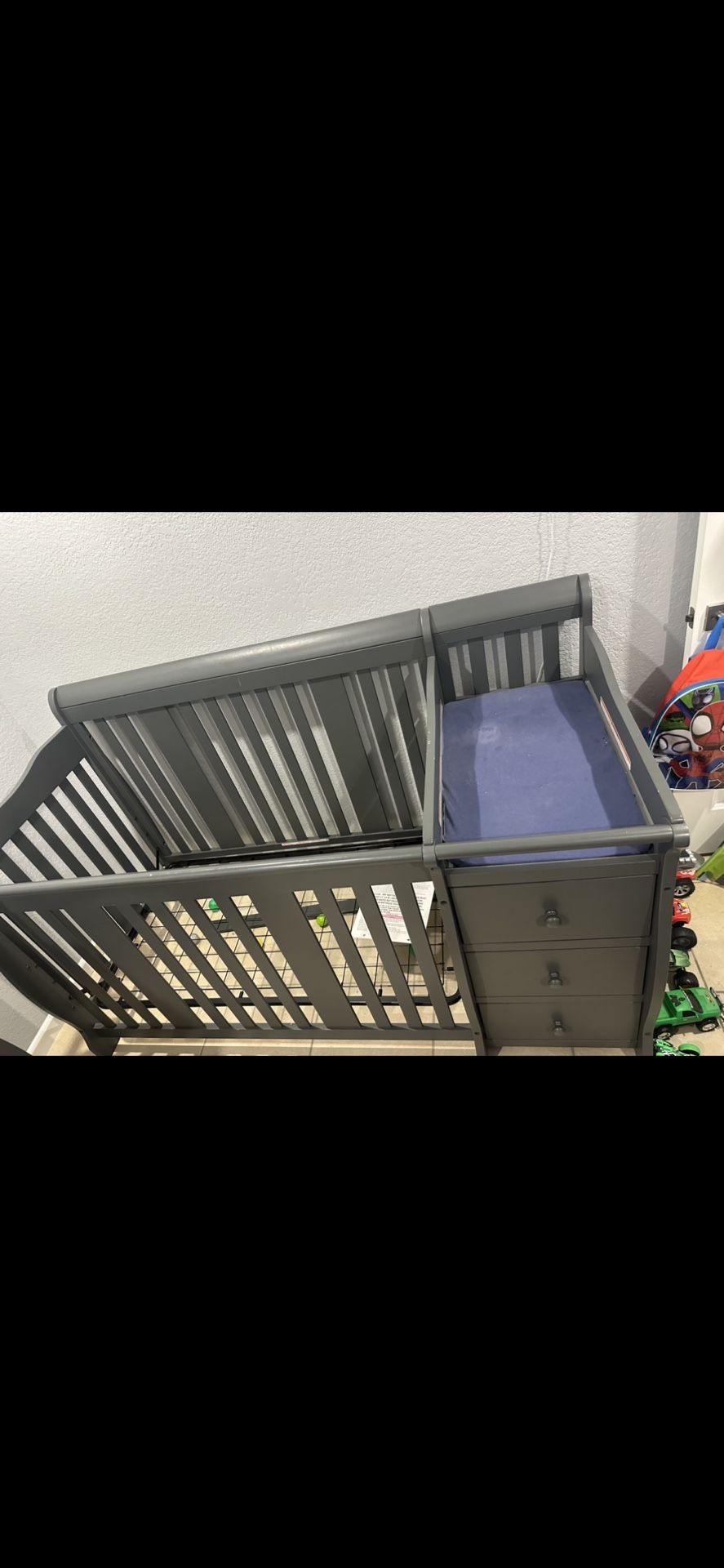 Gray crib with connected changing table, drawers and side storage. Son slept in it only a handful of times. Has little chipped paint marks on the boarder other than that it’s in great condition, seen in photos. Paid originally $380 for it. Asking $60 OBO