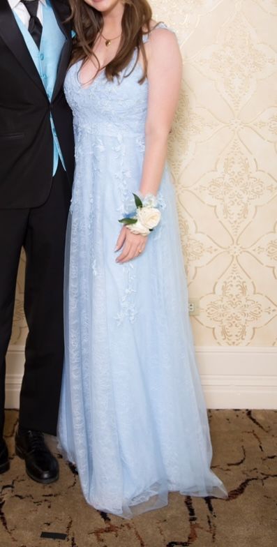 This gorgeous formal gown was worn once as a prom dress and is in impeccable condition. A top layer of beautiful floral and vine designs travel over the dress and along the straps. Size 14