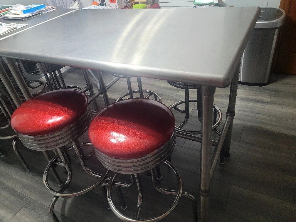 I have 2 table and stool sets. Tables are 4'x2.5' and 40" tall. Stools are 30" tall. Selling each table separately for $800 or both for $1500.