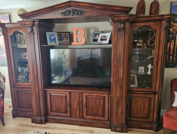 I have a beautiful entertainment center for sale. It is all solid wood and heavy. Some wear and tear that is pretty normal. Paid well over $4k for this set up. Dimensions are 87" Tall, 120" wide, 31" Deep at the tallest, widest, and deepest points. It has several pull out hidden storage areas (not pictured). Must have multiple people to move it, it is quality heavy! It is taken apart and ready to go! Text 805 835 three641