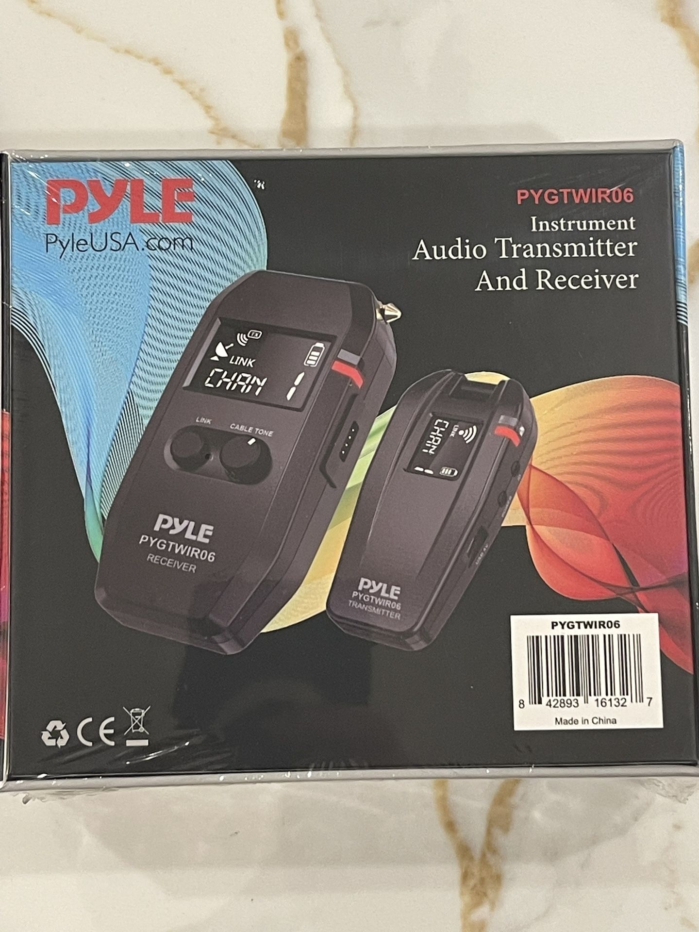 Brand new audio transmitter and receiver for musical instruments like electric guitar, violin and drum set. Wireless.