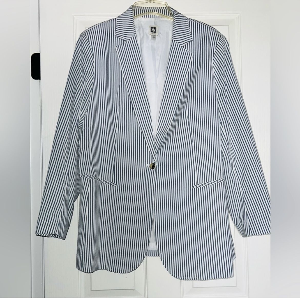 🚨Pick up only ! ⭐️New My lost your gain can’t return lost receipt Stylish striped blazer with a single button closure. Perfect for formal or casual wear. Ann Klein NWOT Striped Blazer Jacket White-Navy Stretchy. Features: Lining inside the blazer , button closer small slit in the back . Size XLG 73% Cotton 24% polyester 3 % Elastane Lined 100% polyester. Thanks for checking out my listings. Smoke free home