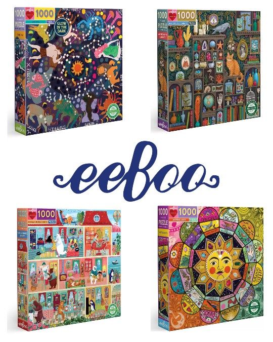 Four eeBoo 1000-piece jigsaw puzzles sold as a single lot. Included puzzles (4 total): 1. Zodiac (Glow in the Dark) — 1000 pcs — new/sealed 2. Alchemist’s Cabinet — 1000 pcs — new/sealed 3. Astrology — 1000 pcs — new/sealed 4. Koala House Party — 1000 pcs — open, completeness unverified