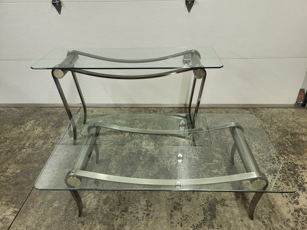 The short one/ cocktail table is 4' 6"× 28"'s Tall one/ sofa table is 4' 6" × 18"'s Brushed chrome finish with glass tops. There are no chips in the glass.