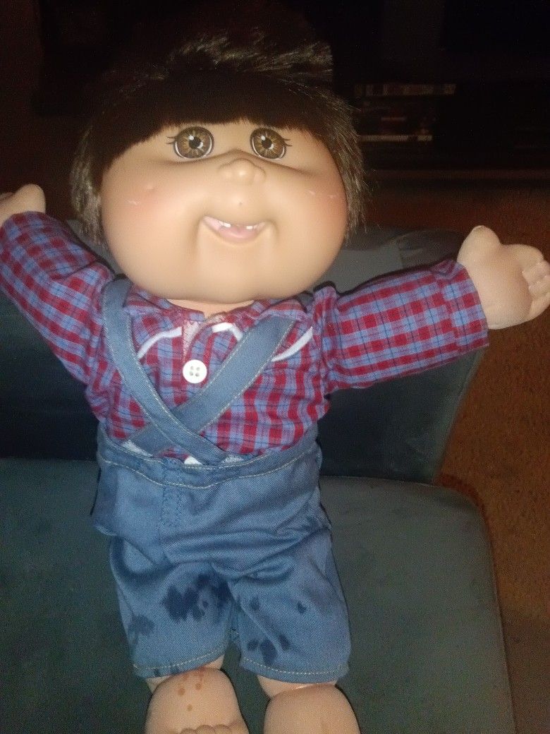 He has straight, light sandy brown hair, hazel eyes and has a big smile where you can see he is missing a front tooth. Wearing overalls pants and a button down shirt. No box or birth certificate with name. Only 75 obo.