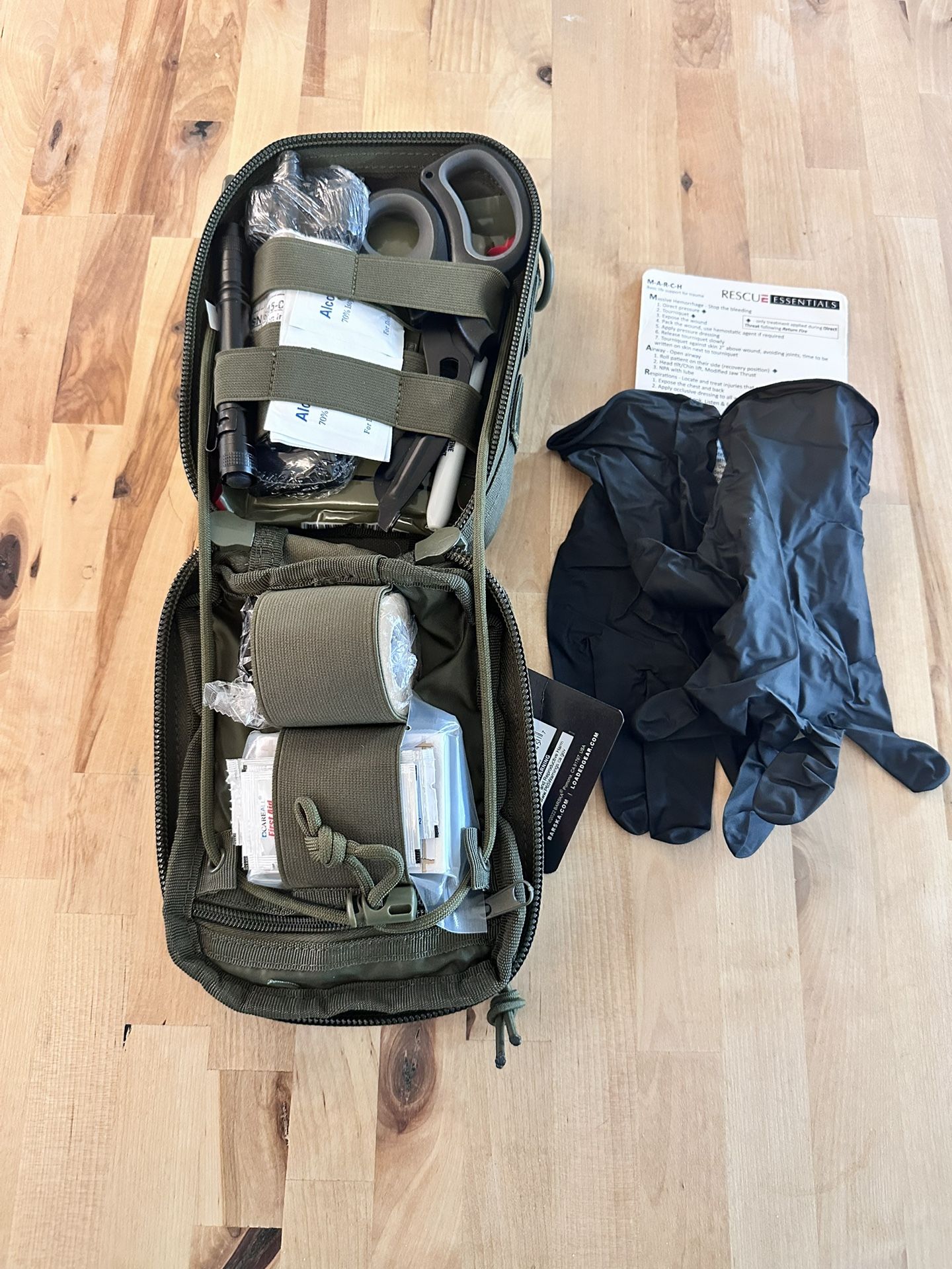 IFAK (Individual First Aid Kit) Selling this high quality very compact bag that is LOADED!! Using the standard MOLLE webbing attachment system, the CX-900 Medical Pouch can be attached to vests and backpacks to ensure that first-aid supplies are readily accessible. This bag is organized and keeps items in place until needed, focused on treating severe trauma and life-threatening injuries, like major bleeding, in high-stress situations, containing essentials like tourniquet, chest seal, and trauma dressings, unlike standard first aid kits for minor issues, this kit is a must have for your home, auto and outdoor enthusiasts. Contents tailored for immediate and critical interventions until professional help arrives. 48 items Included in this kit: 4- Acetaminophen packets 2- 500 mg ea. 1- Vitamins A&D ointment 2- Iodine swab stick 8- Alcohol prep pads 3- First Aid burn cream 4- 2” x 2” sterile gauze pads 3- 3” x 3” sterile gauze pads 2- Wound closure strips 1- Vented chest seal 1- 6 inch emergency trauma dressing 1- Cat tourniquet 1- Sharpie 1- Cohesive bandage 2” x 5 yards 1- Compressed gauze 1- First aid tape 1“ x 10 yards 1- Medical scissors, trauma shears 1-Forceps 1- Pair nitril gloves large 8- Curity bandages 1” 1- pen, flashlight 1- MARCH trauma assessment card 1- Loaded Gear CX-900 first-aid pouch. Measures Approximately. 8”L x6”W x4”H (4 available)