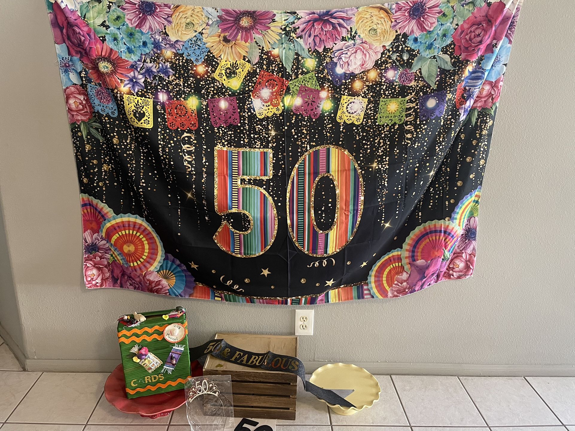 I used this decoration for my birthday 50. And I hope some also can enjoy , includes the crown and sash 2 plates for cake, one box for your birthday cards and the back drop and a 50 for the cake and a gold happy birthday cake topper and the wood box if you need it ! I do have table runners. Zárape strips color eve. The center pices for the tables ! Let me know if you are interested I will send you pictures. ‘Make me an offer ! Thank you 🙏