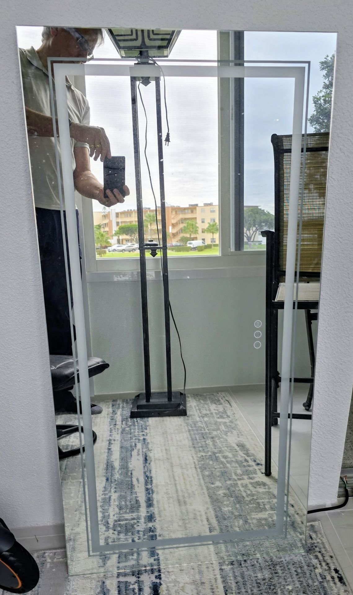 Approximately 24 x48 LED bathroom mirror,back and front lit with ant fog. Works fine like new. Wrong size our mistake your gain . First $50gets it.