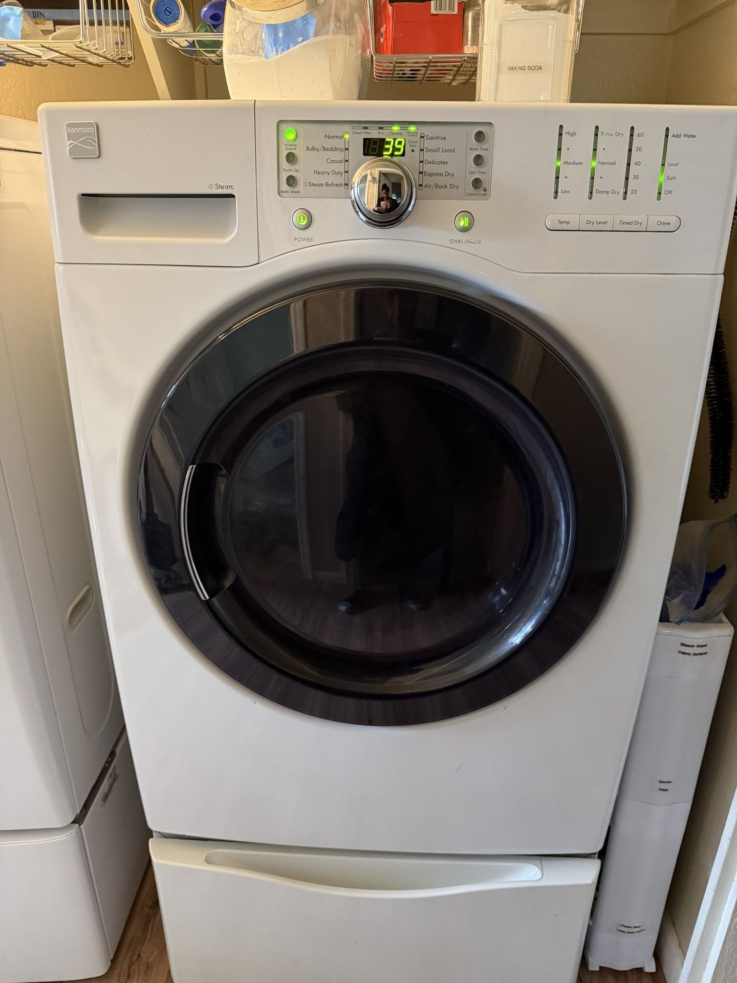 Working white Kenmore front load dryer with Steam Refresh, interior lighting. 27” . Fits King Sized comforter easily. (Pedestal not included)