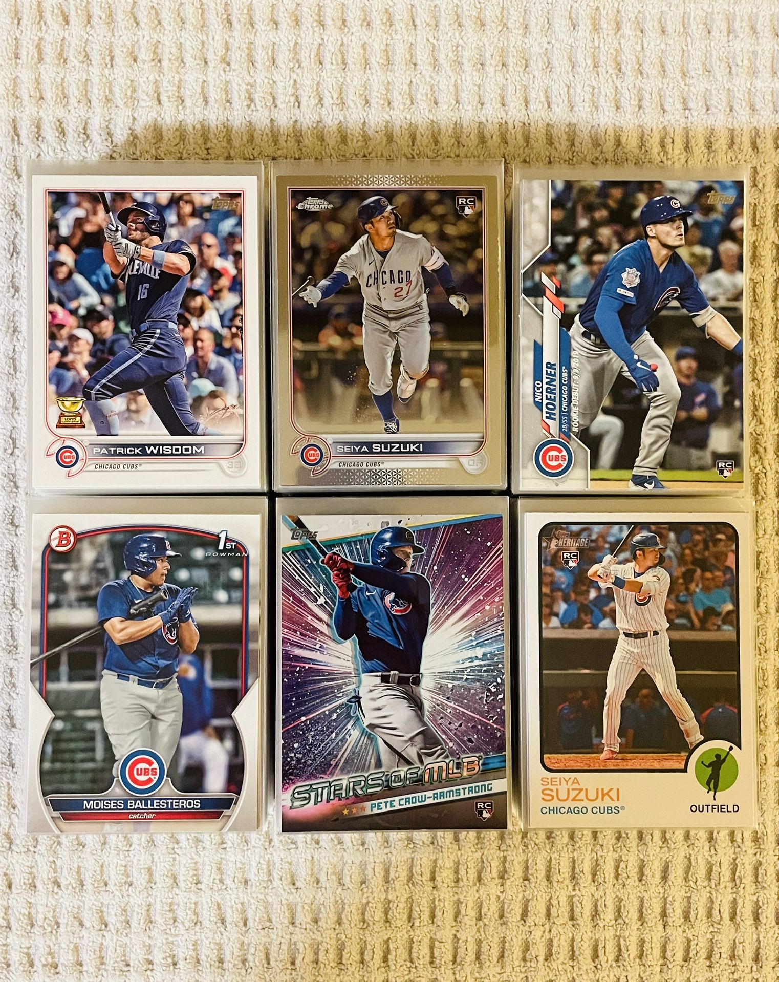Chicago Cubs 320 Sports Card MLB Baseball Card Team Lot! All cards in mint condition! Rookies, prospects, All-Stars, HOFers, inserts, parallels, short prints, exclusives, variations & more! Mix of Series 1, Series 2, Update Series, Opening Day, Donruss, Donruss Optic, Topps Chrome, Select, Heritage, Stadium Club, Stadium Club Chrome, Bowman, Bowman Chrome, Upper Deck & more! Seiya Suzuki, Nico Hoerner, Patrick Wisdom, Pete Crow-Armstrong, Ian Happ, Dansby Swanson, Miguel Amaya, Nick Madrigal, Kevin Alcantara, Jameson Taillon, Justin Steele, Adbert Alzolay, Keegan Thompson, Hayden Wesneski, Caleb Kilian, Brennen Davis, Ed Howard, Moises Ballesteros, Cristian Hernandez, Luis Verdugo, Jefferson Rojas, Kris Bryant, Anthony Rizzo, Javier Baez, Sammy Sosa, Ernie Banks, Ryne Sandberg, Ron Santo, Mark Grace, Andre Dawson, Aramis Ramirez, Kerry Wood, Rick Sutcliffe & much more! $50 for the lot! Local pick up & shipping available. Message for details. Thank you!