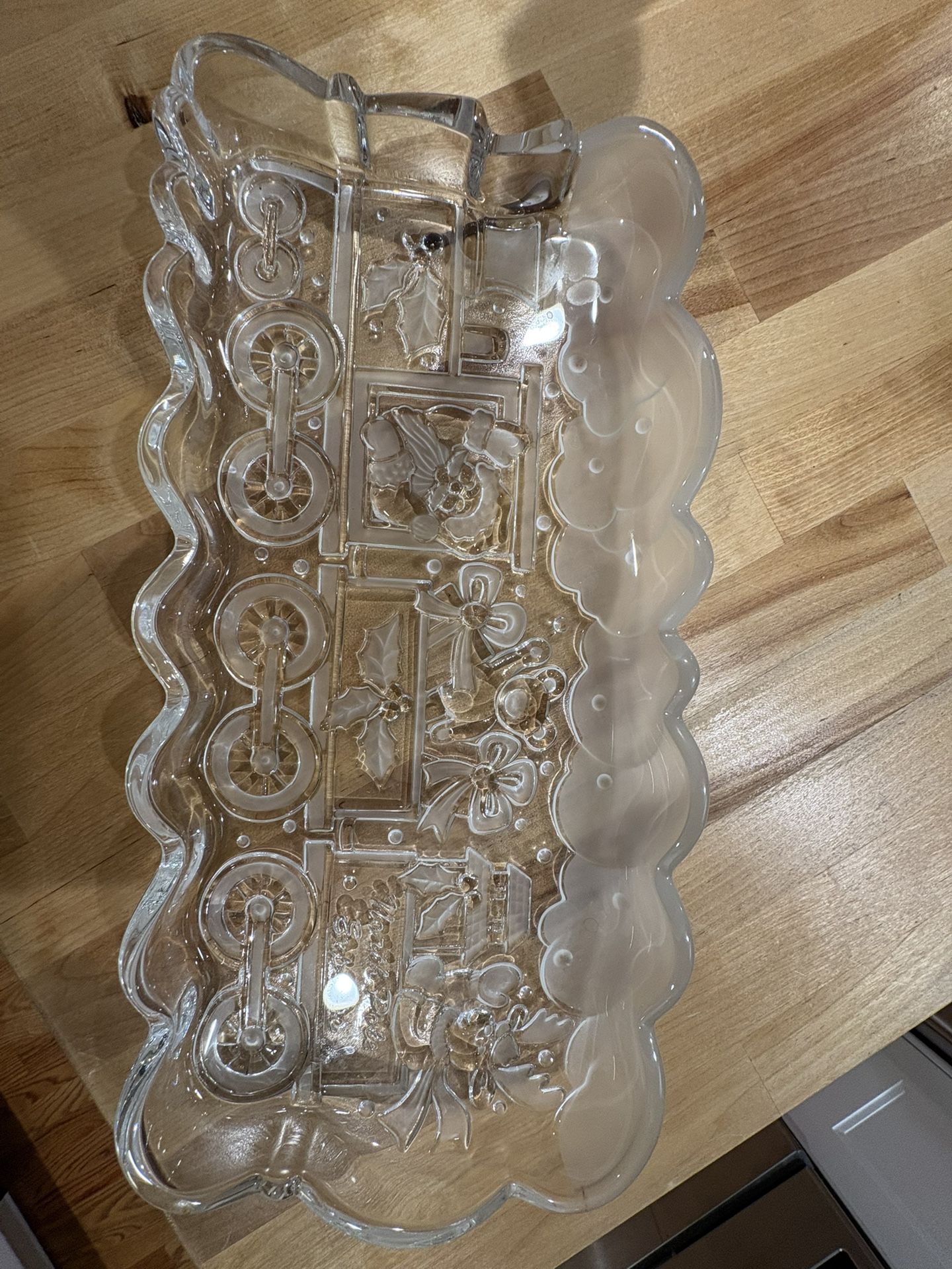 This is a Gorham Crystal etched Christmas platter showing a depiction of the North Pole express with festive motifs. Great serving platter for the holidays that is resilient and pretty. Open to questions.