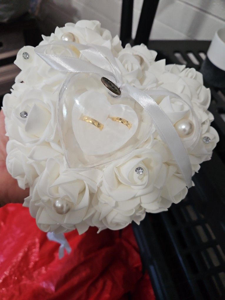 Beautiful heart shape with white roses ring holder. Brand new.