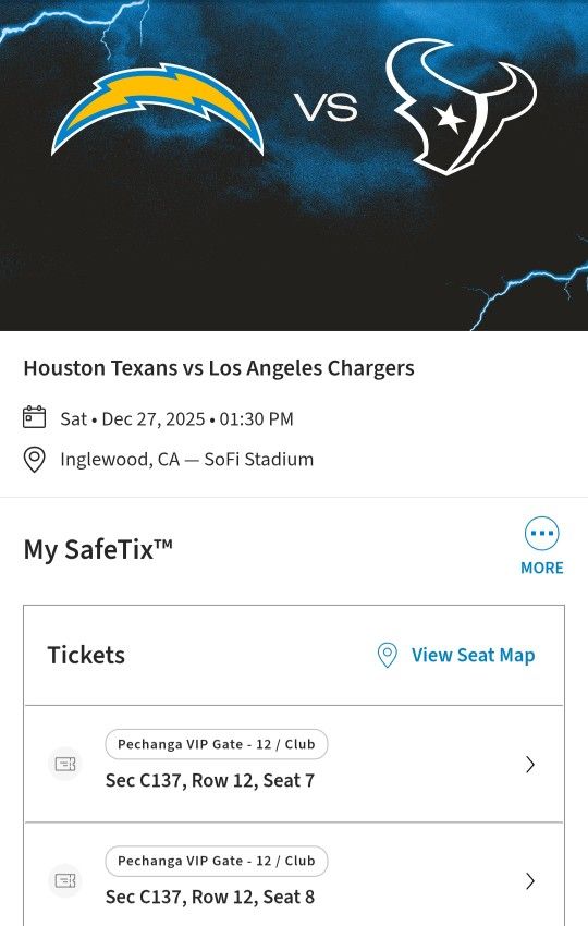 Saturday December 27th 1:30pm Chargers vs. Texans Club Seats Section C137 Row 12 (3 rows from the field) above visitors tunnel Perfect Christmas Gift! $300 each VIP / Access to Google Lounge