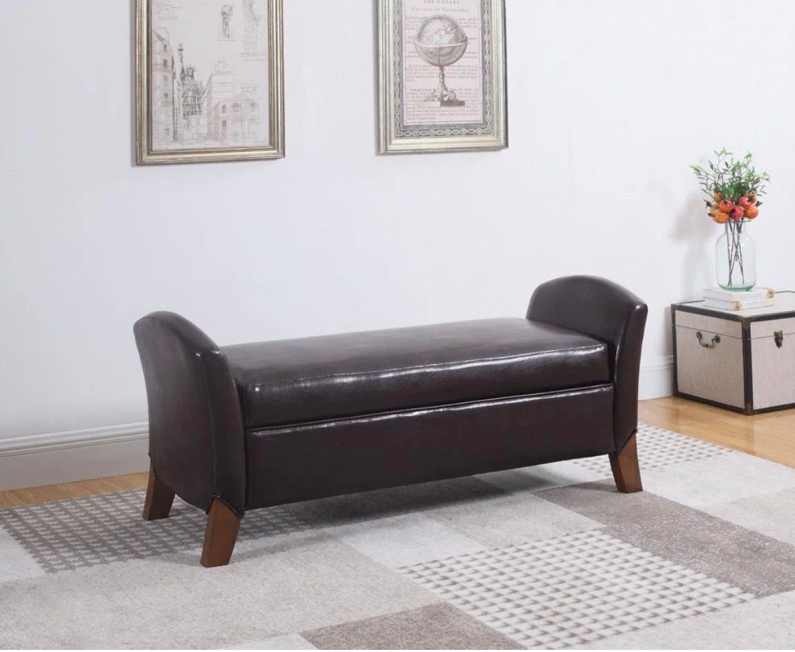 This is new! Retail price $465 Buy from us and save !! New coaster Upholstered Brown Faux Leather Bench This chic bench is upholstered in a dark brown faux leather that compliments its legs espresso finish. Beautiful lines are created by the splayed legs that meet at the bench's curved arms. With ample storage under the seat, this bench is great in an entryway or bedroom. Length: 55” Width:19.25” Height: 24.75”