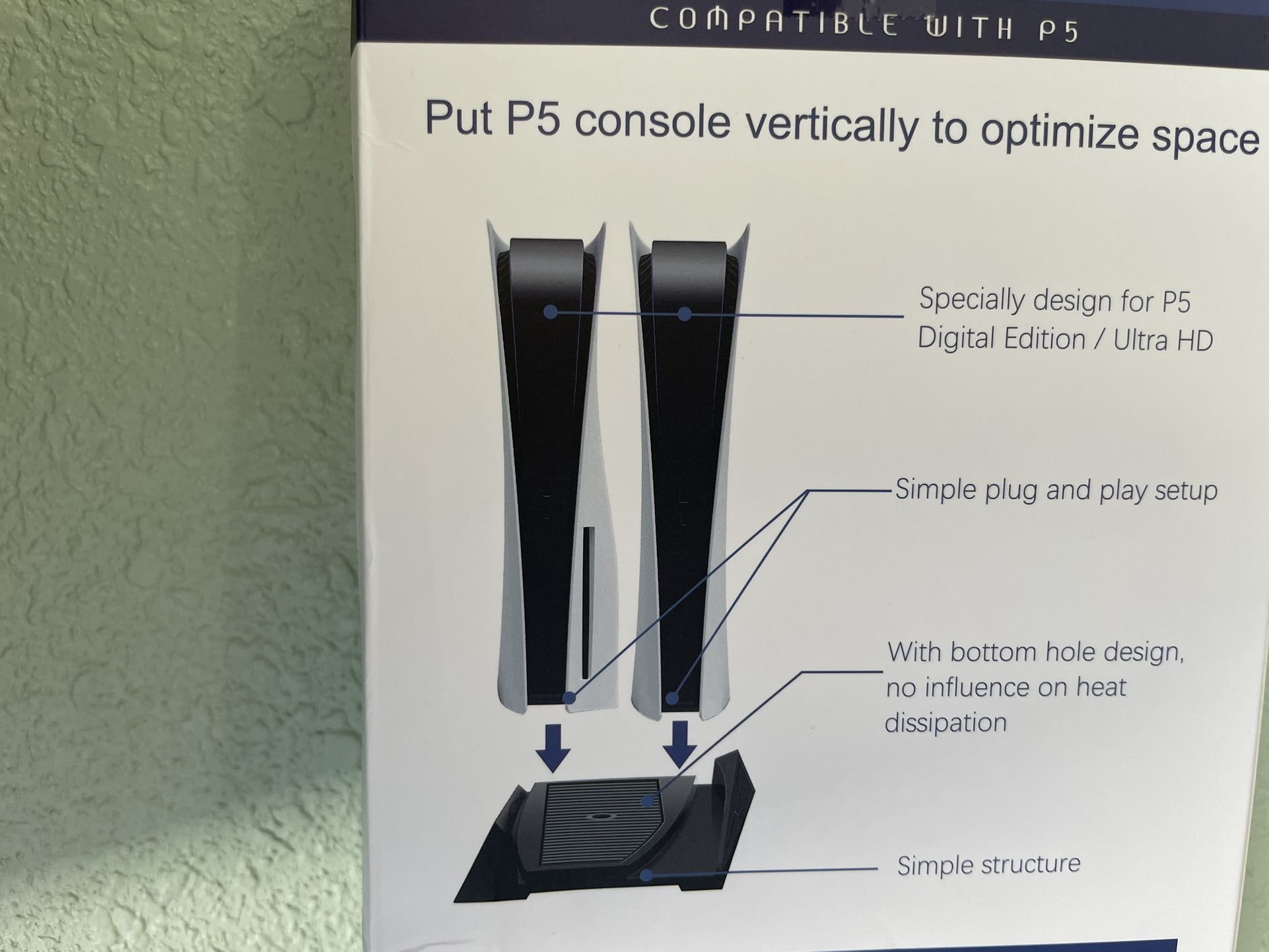 This stand allows to position your PS5 to stand upright. Bottom is vented for air circulation. New in box.
