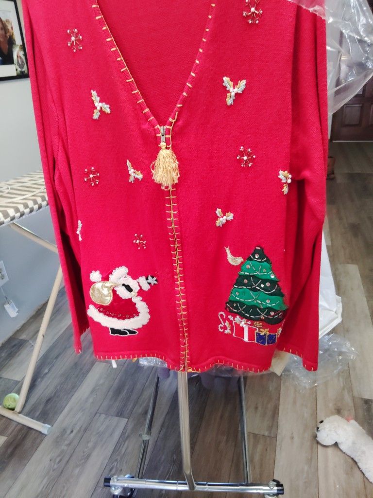 Christmas cardigan red plus size with gold trim only worn one time still in dry cleaning plastic 1X plus size