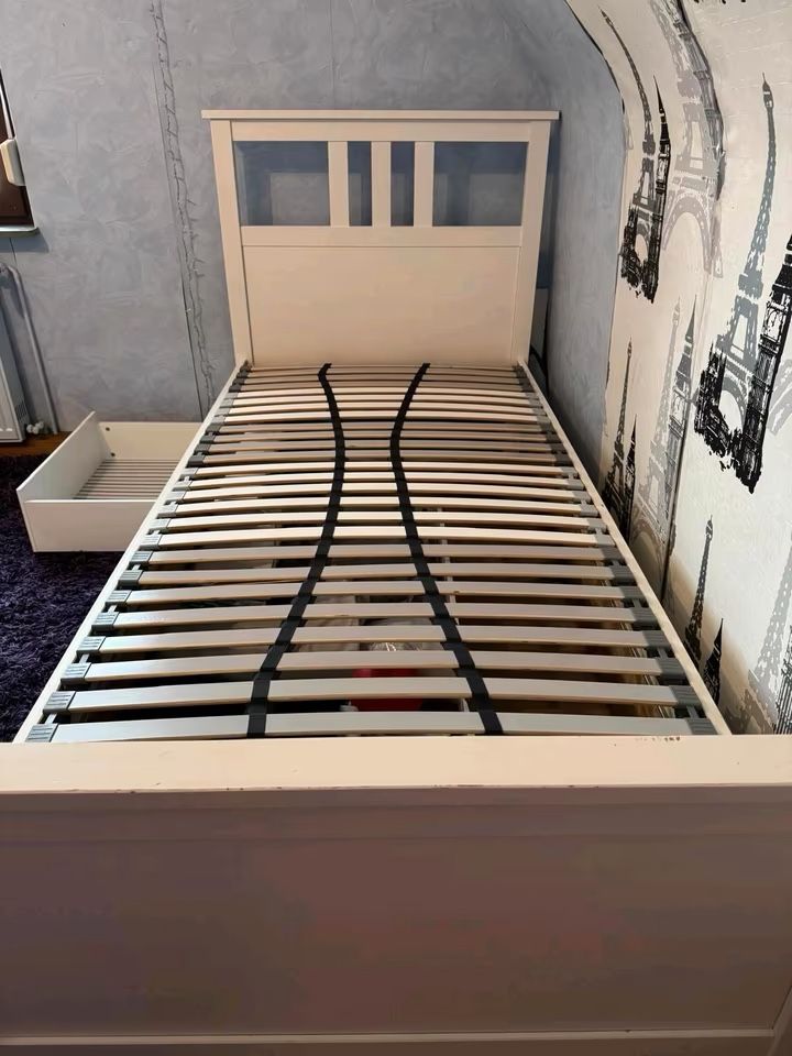 This is a twin-size, white color bed from IKEA, complete with one double drawer and one single drawer that fit underneath the bed. The bed frame is gently used, in excellent https://offerup.com/redirect/?o=Y29uZGl0aW9uLkl0's a great choice for a first big-kid bed or for a small bedroom where space is limited, thanks to the spacious drawers that fit under the bed. You can store everything from clothes and shoes to linens and toys. The drawers are strong, reliable, and sturdy, and they're freestanding, so you won't need any rails. The bed was originally purchased from IKEA for $527 all together. This was the most expensive version of this bed at Ikea because of the slatted bed base, which is Lonset- super reliable and sturdy panel base, especially for a kid! The exact dimensions can be found in the photos. The bed is disassembled (though the drawers are not) and ready for pickup. All hardware is included, along with the wooden slated bed base, and no box spring is needed since it's a platform bed. Assembly is super easy! I can assist with local delivery if needed.