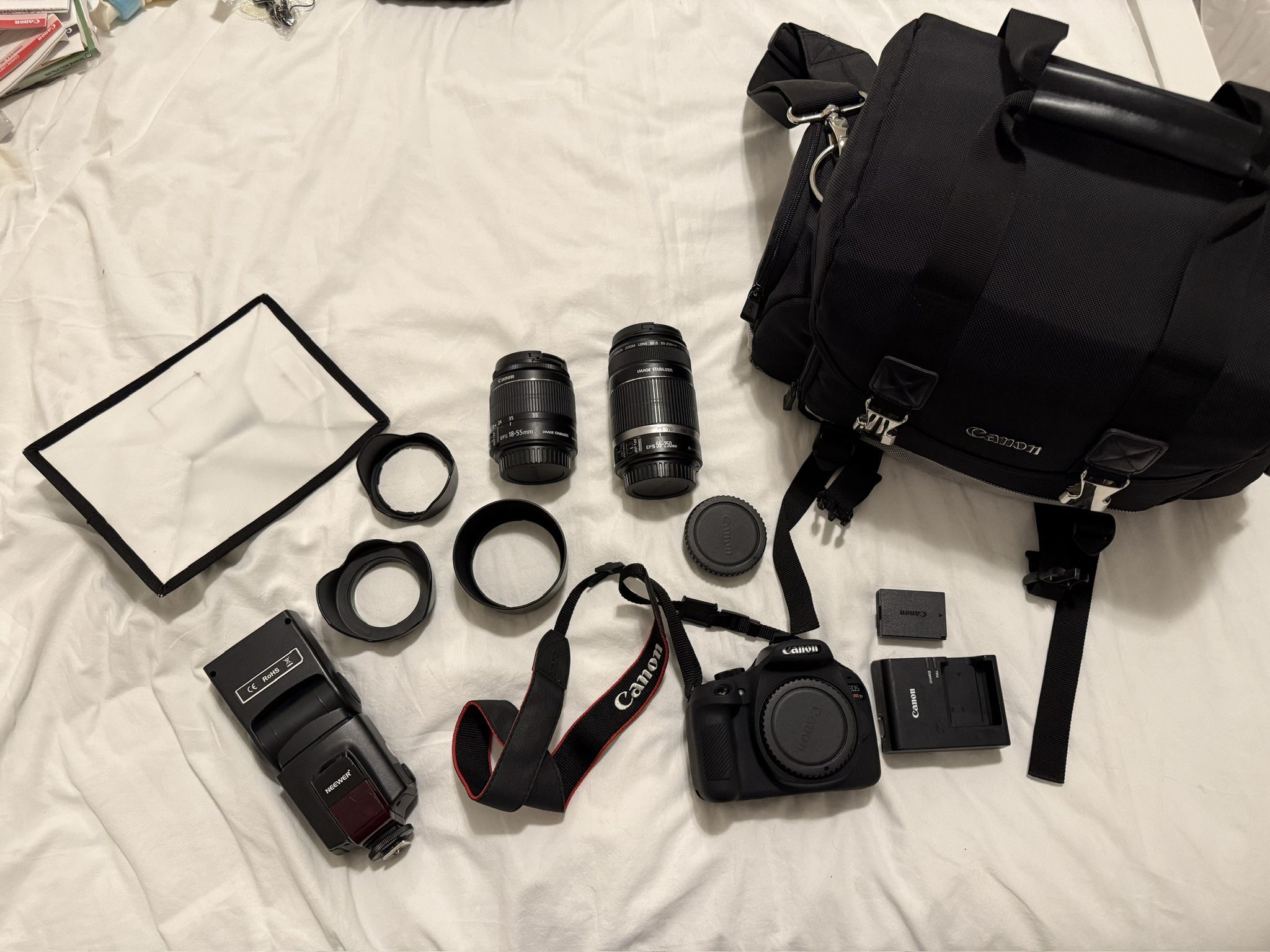Great condition camera canon EOS T6 with many extras. Camera in great condition has always been in a protective camera silicone case when in use. Includes Canon EOS Rebel T6 EFS 55-250mm lens EFS 18-55mm lens Neweer flash TT 520 speedlite Flash soft box adapter Battery charger with 2 batteries 3 Lens hoods Original paperwork and materials Canon carrying bag