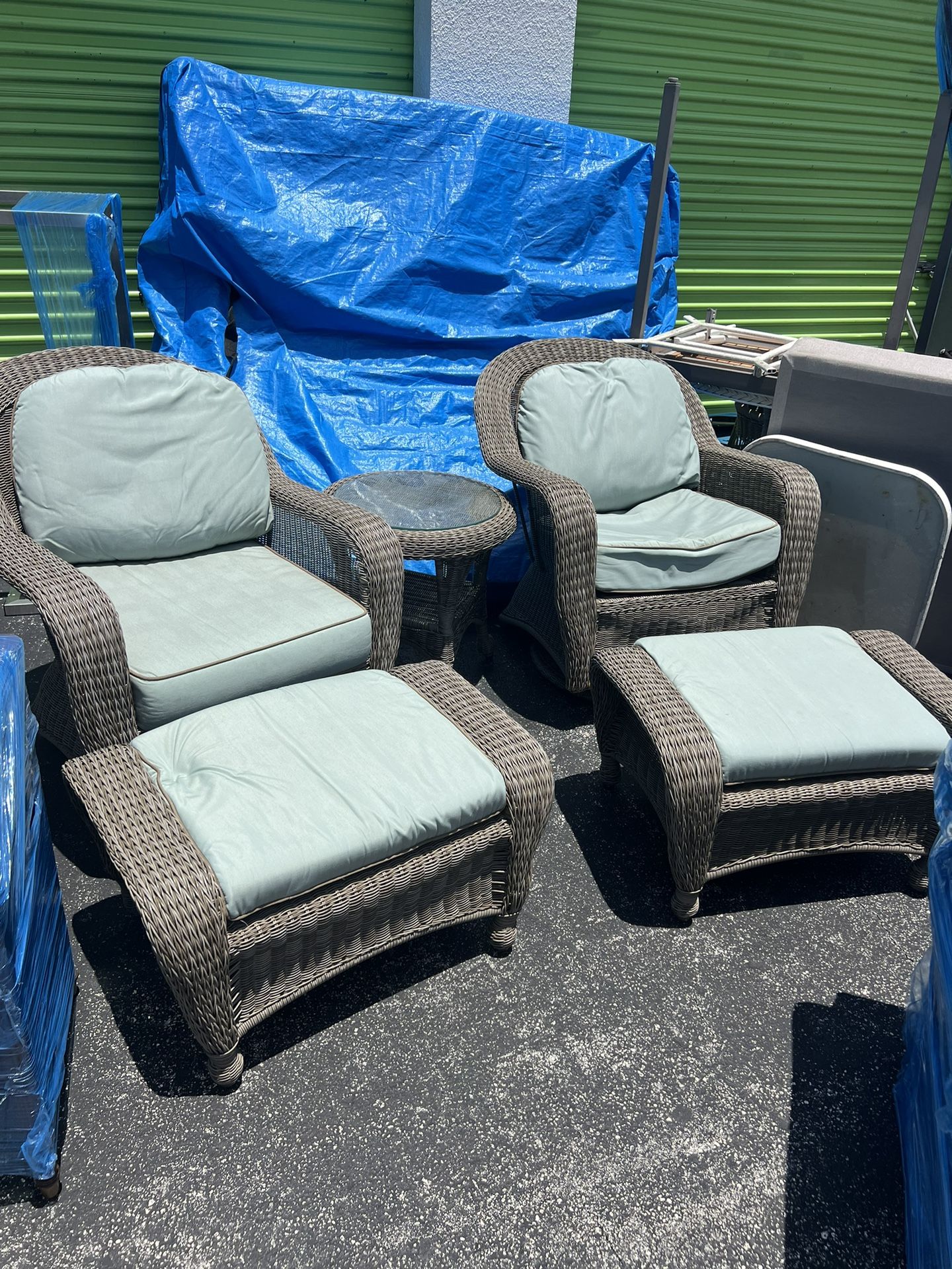 Barely used patio furniture with glass tops for both tables. The two chairs both swivel.