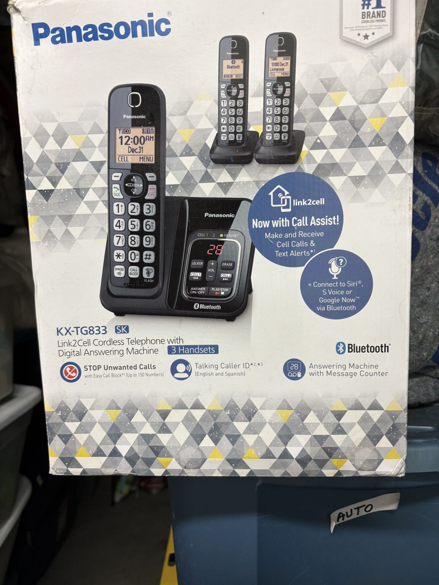 3-set Panasonic cordless telephone and answering system. In box (new). Never used.