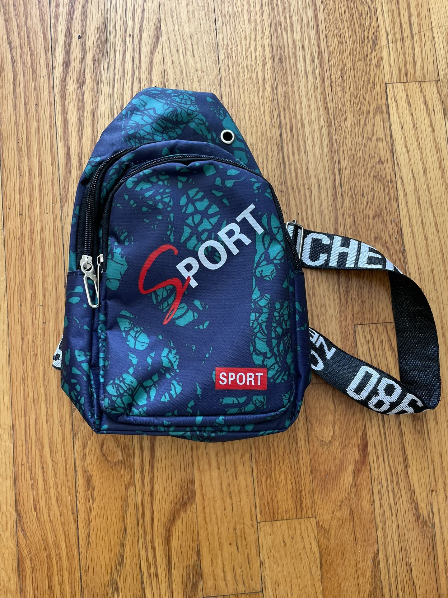 It is a portable multi-functional shoulder bag (Sling Bag/Chest Bag), usually classified as a sport and casual style. • Design: It features a classic teardrop shape that can fit against the sides or chest of the body. The bag has a headphone hole (the metal ring on the upper right corner of the front), which makes it convenient to connect wired headphones when placing your phone or player inside the bag. • Pattern: The bag body has a dark blue base color with irregular green floral/military texture patterns. The front is printed with a prominent "SPORT" letter logo. • Shoulder strap details: It comes with wide black and white colored fabric straps, with letter decorations printed on them (the letters look like random fashion element designs). • Functional compartments: There are two zipped compartments (main bag and front secondary bag), which can hold small items such as mobile phones, power banks, keys, and wallets.