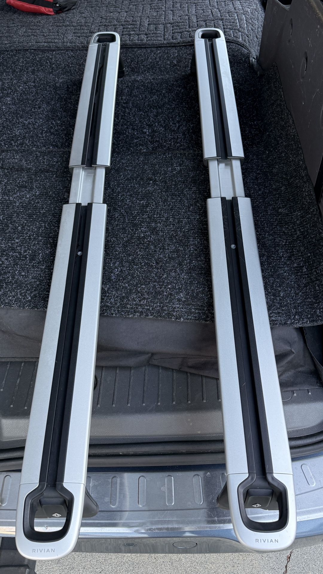 Preowned Rivian R1S/R1T cargo crossbars. Two master keys. Good condition, small scuff mark on one crossbar.