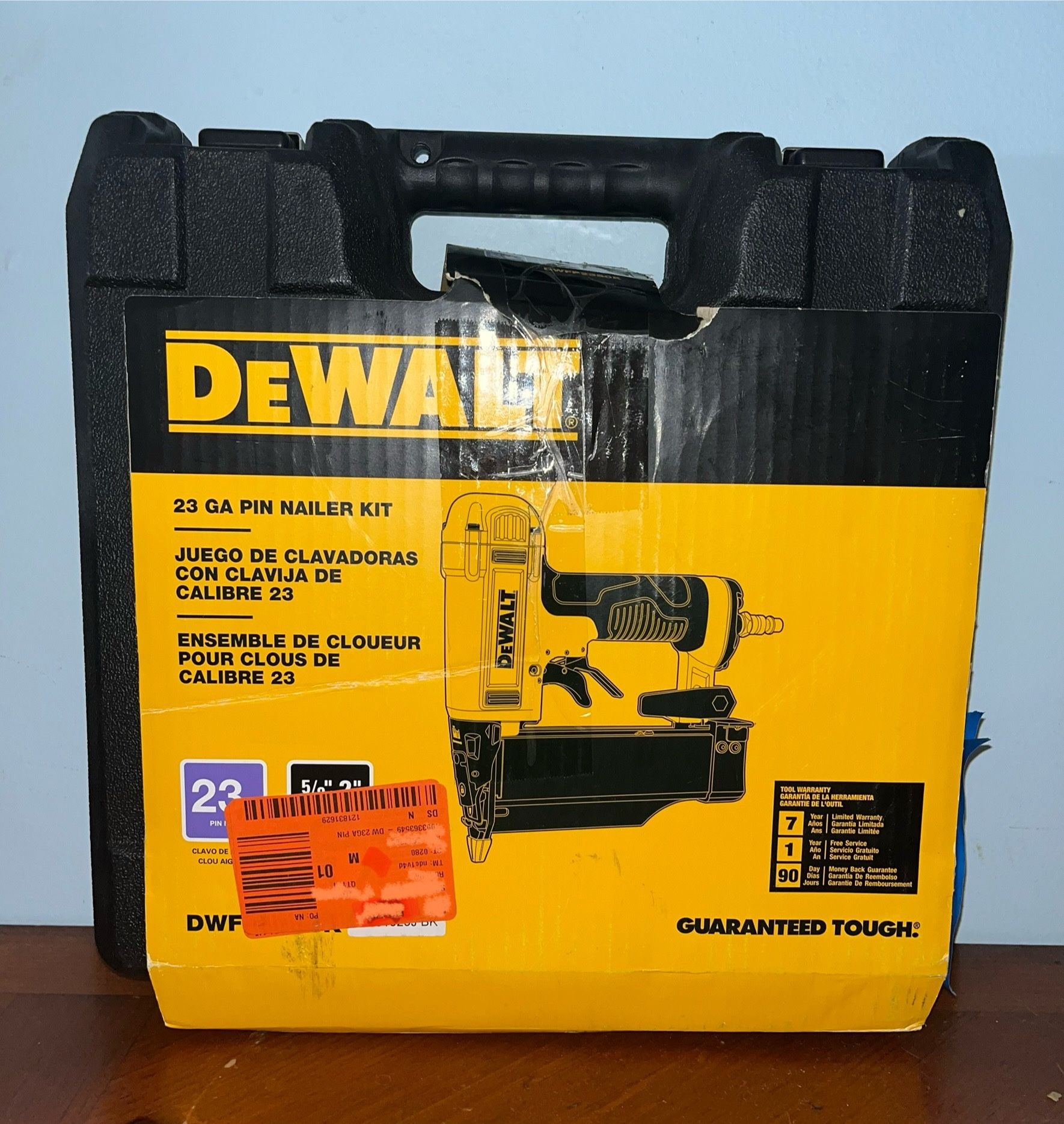 Brand new in the box (never opened). Take advantage of this steal - 23 Ga pin Nailer - (2) no Mar tips - 1/4 Fitting - Belt hook