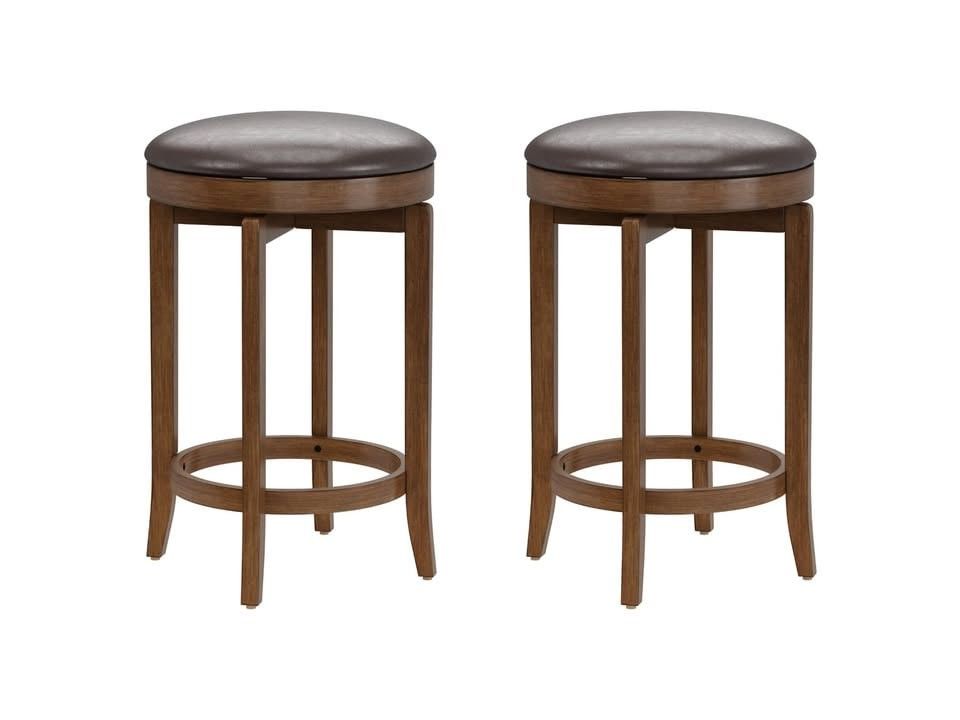 The actual value of each stool is $102+Tax... These are brand new, for pickup payment mode is cash Simple and versatile, the Hillsdale Furniture Brendan Backless Swivel Counter Height Stool has a Brown Cherry wood finish and Brown faux leather upholstery that blends seamlessly with most décor. Its padded seat and 360° swivel functionality make this counter height stool comfortable and convenient -- while the perfectly placed footrest makes it easy to relax and reinforces the structural integrity of the backless stool. Ideal for kitchen islands and counter-height dining tables. Assembly required. Modern backless round wood swivel stool; available in Counter Height and Bar Height Brown Cherry wood counter stool with Brown faux leather upholstery and footrest The round 360-degree swivel seat is upholstered in a rich brown faux leather Overall Dimensions: Counter Height: 25H x 17DW x 17D Works best with counters or tables that are 34-38 inches in height
