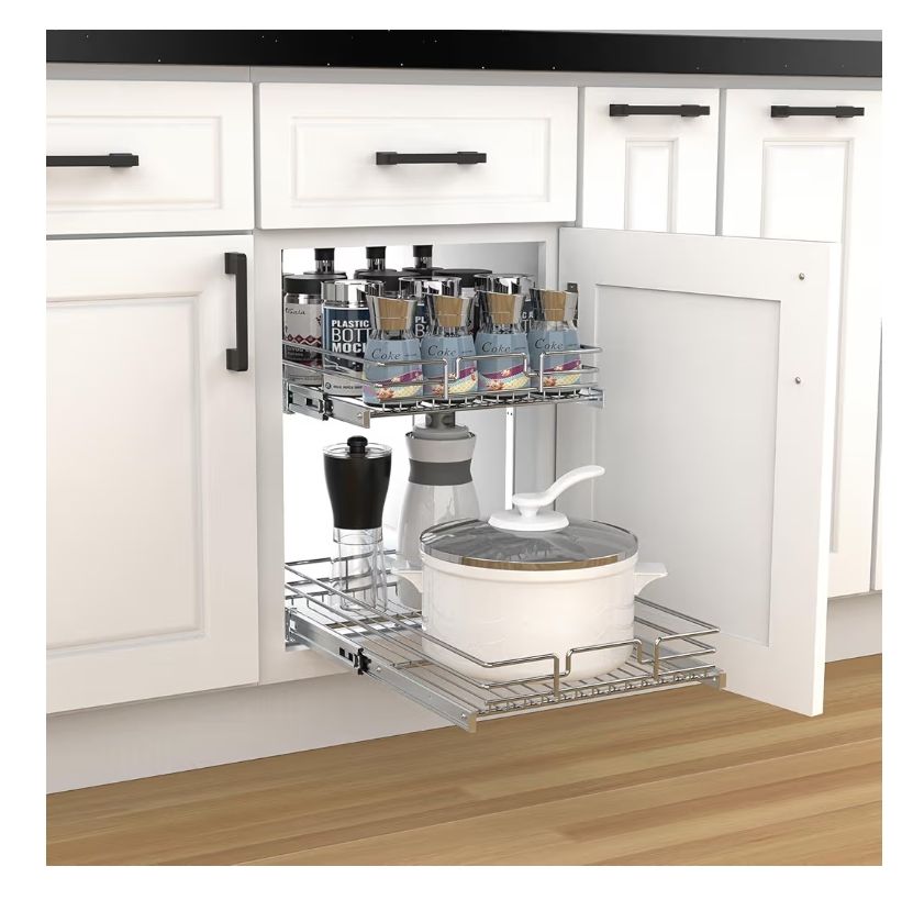 New/ Open Box $80 Amazon Price $45 My Price Overall size: 11 “W x 21 ”D x 15.5:H (maximum size, actual use size will be 1-2 inches smaller). Fits minimum 12“ cabinet opening, 24” deep, 18” high (measurements do not include hinges).Basket Size:9.69“ W x 20.98” D x 2.76” H Height Adjustable: easily solve the problem of wire baskets not being able to be pulled out due to cabinet edges. Minimum height is 13.5 inches, maximum height is 15.5 inches. Suitable for all sizes of cabinets and kitchen appliances Easy to install: the package includes the necessary accessories for installation. Multiple screw fixings for sturdy construction. Both shelves pull out individually, and the Pullout Cabinet Organizer is strong enough to hold up to 80 lbs Easy Access: Organizing your cabinet space has never been easier with the Pulloutor 2-Tier Pullout Cabinet Organizer. Ideal for pots and pans, small kitchen utensils, canned food, cleaning products and more