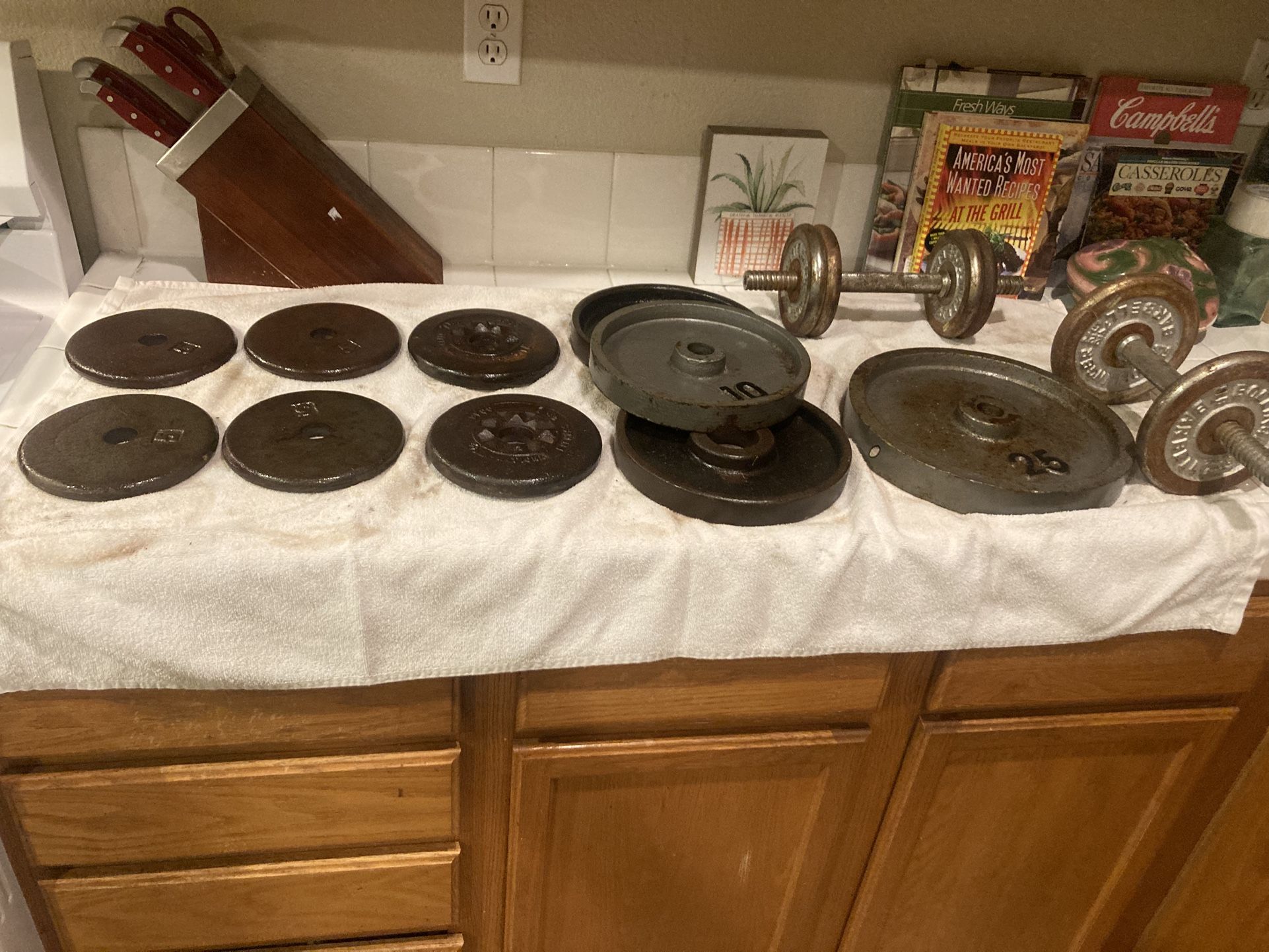 112 pounds of metal weight for sale. It breaks down like this. Four 5lb weights, two 7&1/2lb weights, three 10lb weights, one 25lb weight, one 12lb dumbbell (four 3lb weights), & one 10lb dumbbell (two 5lb weights). For a total of 112 pounds of weights +2 bars for the dumbbells.