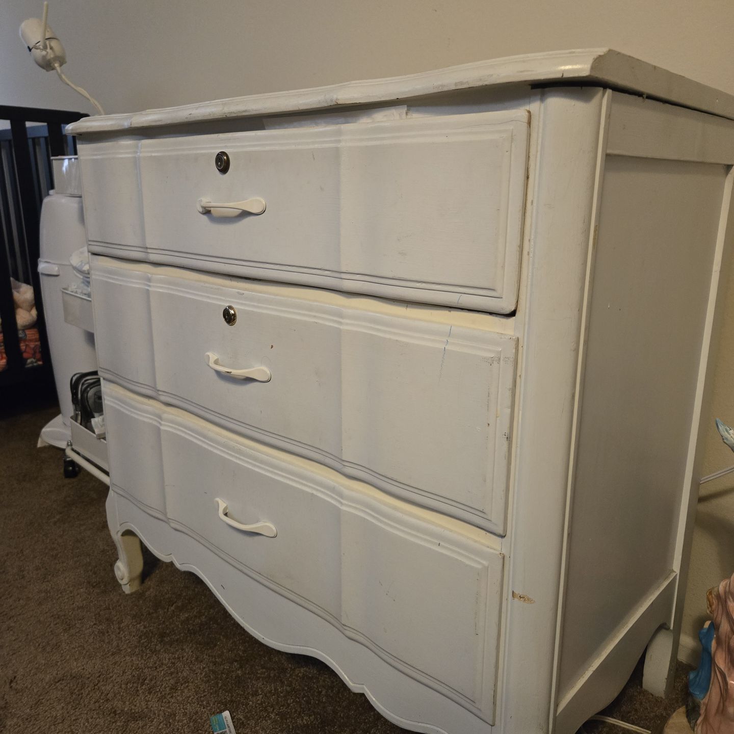 This white French Provincial style dresser likely features a three-drawer design with ornate pulls. In great condition solid wood and real vintage. Has locks for drawers. 30.75"H x 32" W x 17.5" D. Free just come pick it up in Long Beach.