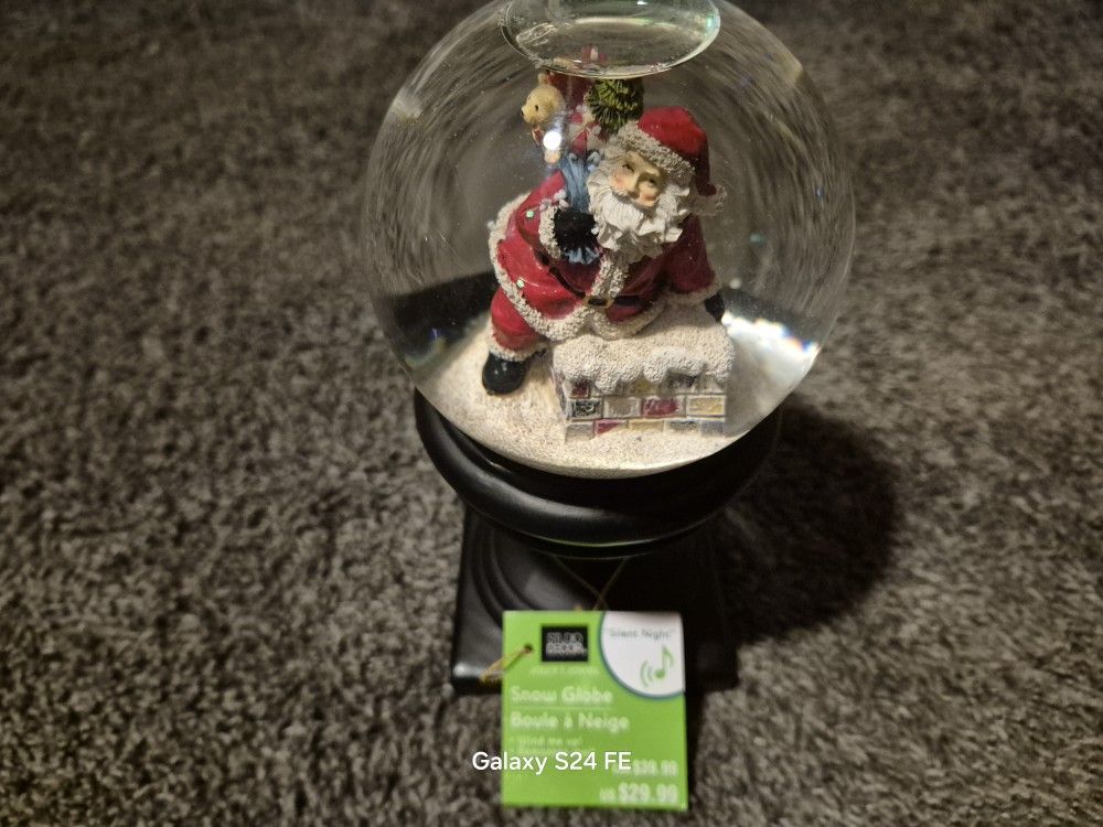 New Christmas Santa Claus snow globe still has the tag glass ball with wood base.