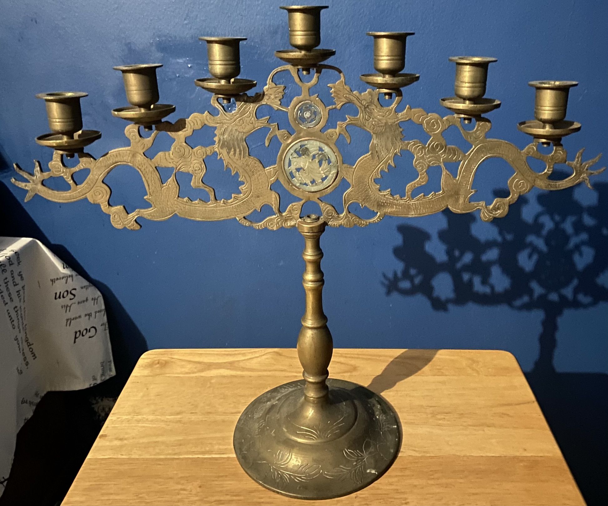 Chinese Dragon Brass/Bronze Menorah With Jade Medallions