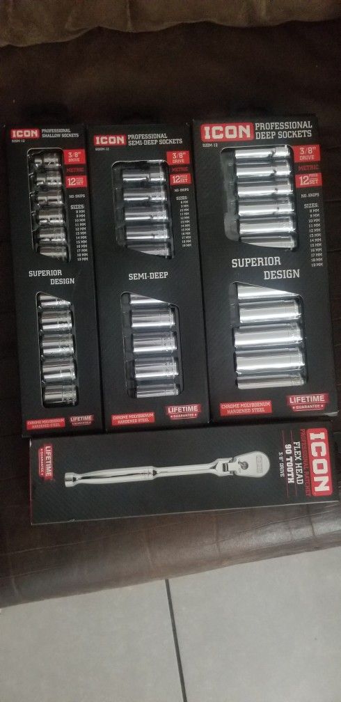 Brand new icon ratchet and socket set them as a bundle deal 3/8 Metric deep, mid, and shallow socket with flex head ratchet selling the bundle deal for 120$ firm