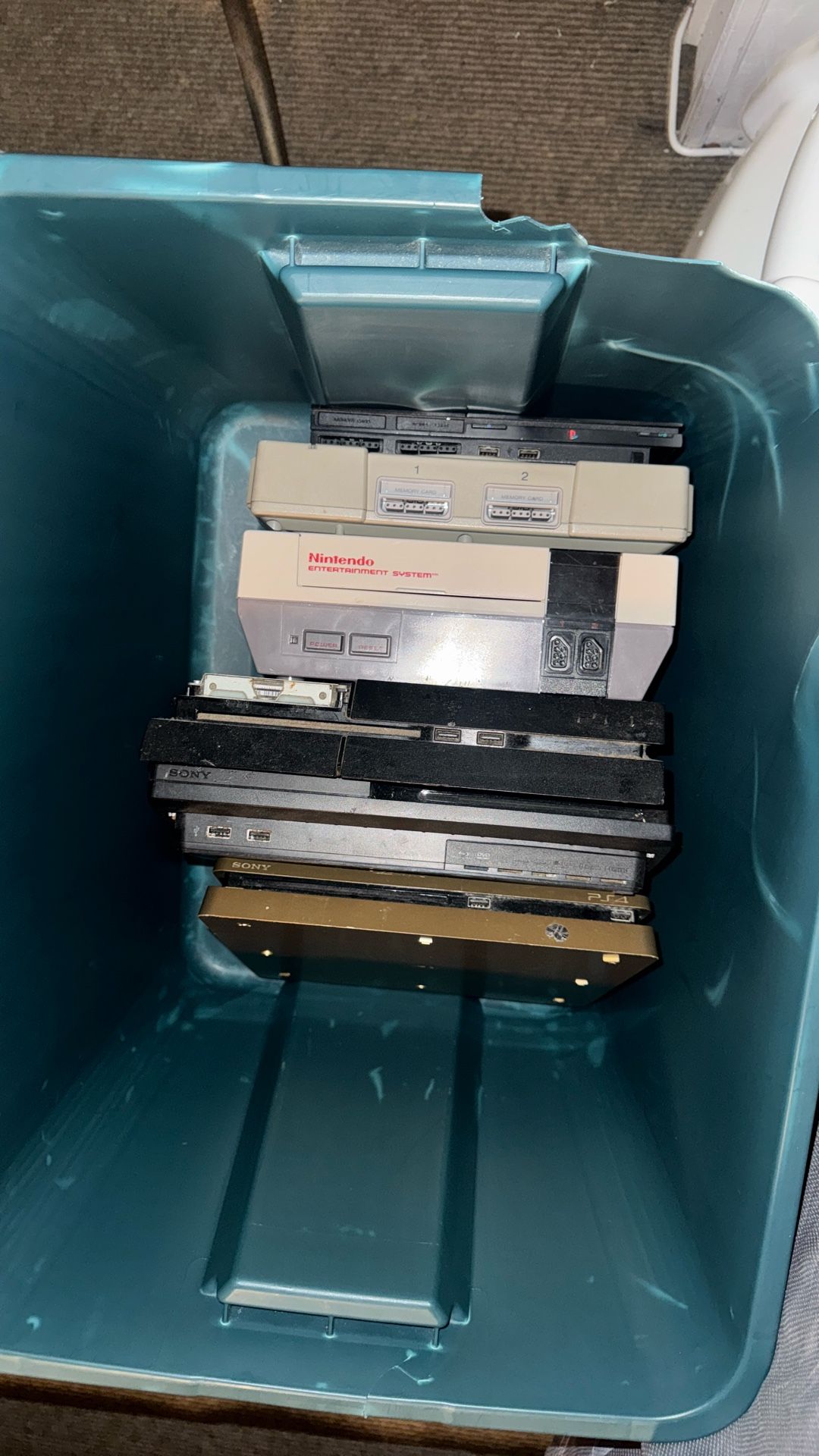 Gold ps4 works , restored to factory settings. Black ps4 no top cover, works , restored to factory settings. Ps2 works no cables. 2 controllers. 4 memory cards PS3 works comes with 2 controllers. Memory card converter. Ps1 no cables , 1 memory card. Xbox 360 controller