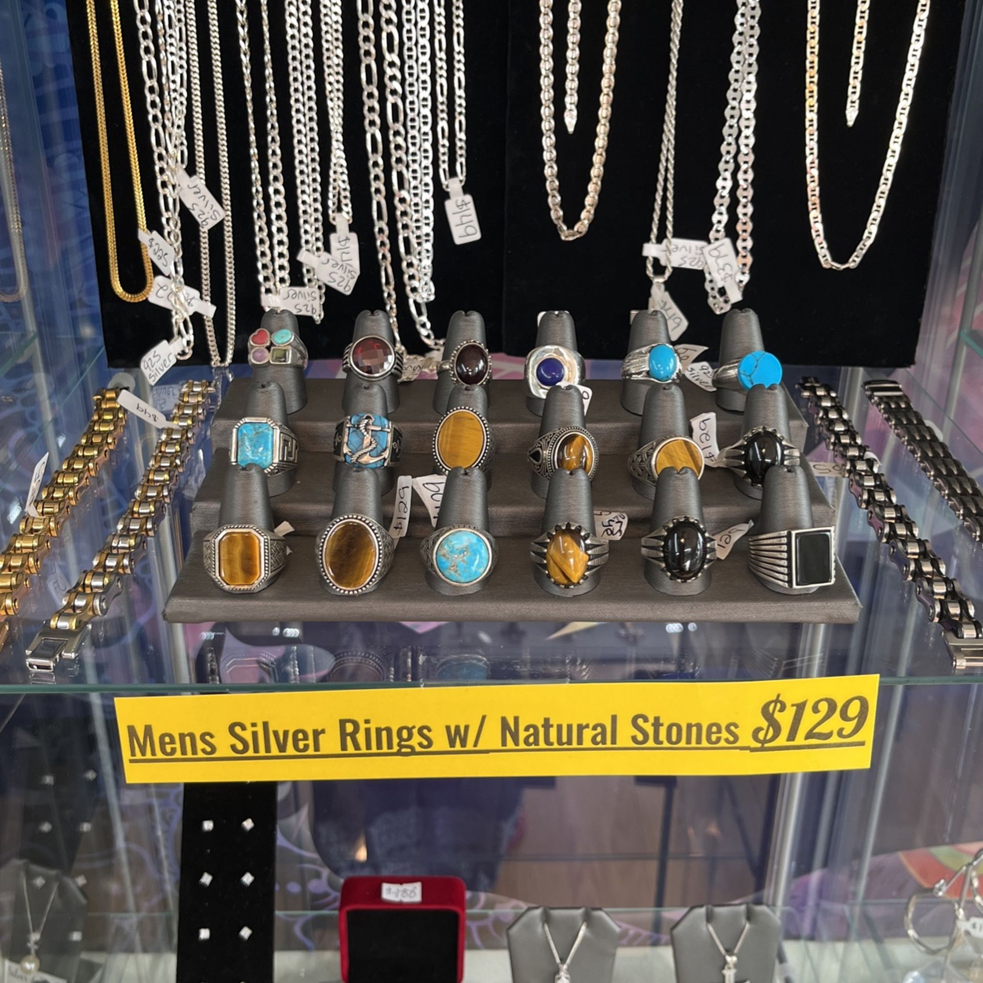 Silver bracelets, silver rings, natural strobes, stainless steel bracelets and much more!!