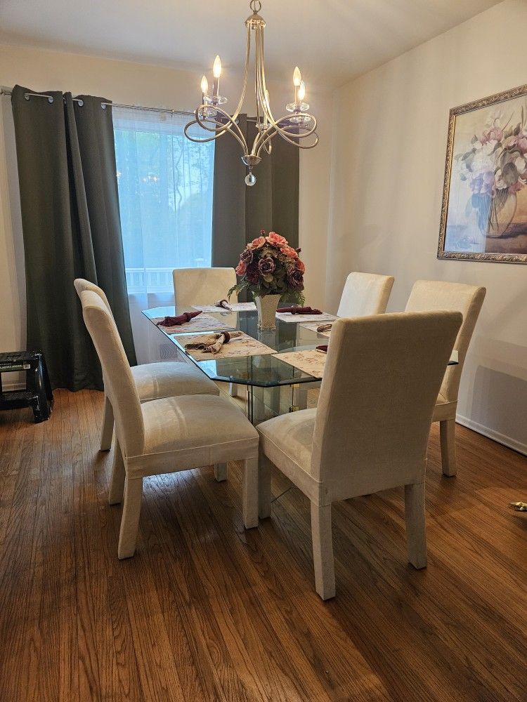 Very good condition glass dining room table. 6 white high back chairs. Chairs need cleaning.