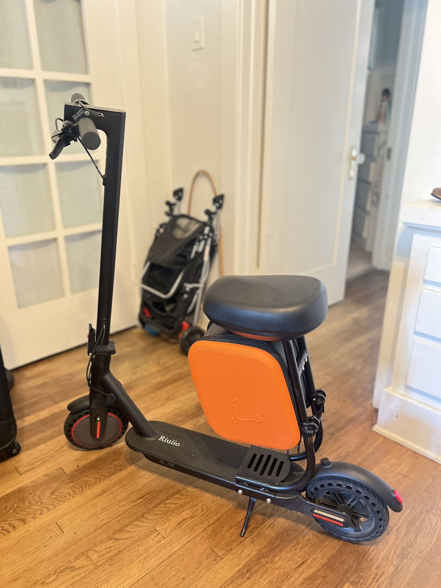 Riuiio Electric Scooter with Seat for Adults 19MPH & 15/21-Mile range, 350W Motor. 8.5” Solid Tires with App Control & Dual brake system.