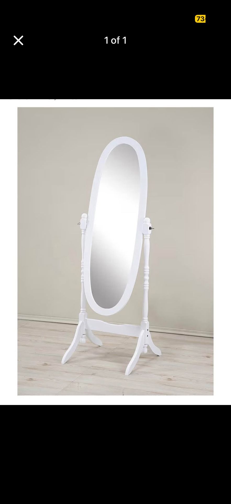 Stylish white full length mirror. Oval shape. Has a stand so it can be moved around easy. Great for checking out outfits. One leg part broke partially but works n stand s well