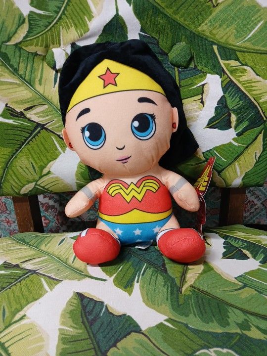 Brand new with tags, never used. Stored properly away from dust and contaminates. Nearly mint condition, tag is bent, only issue. Soft velvet on the hair area. Collectible Wonder Woman DC Justice League plush. Delivery or pickup. This item is cross listed on other sites, so first come, first serve. Approximate measurements are as follows: Height - 10½" Width - 6½"